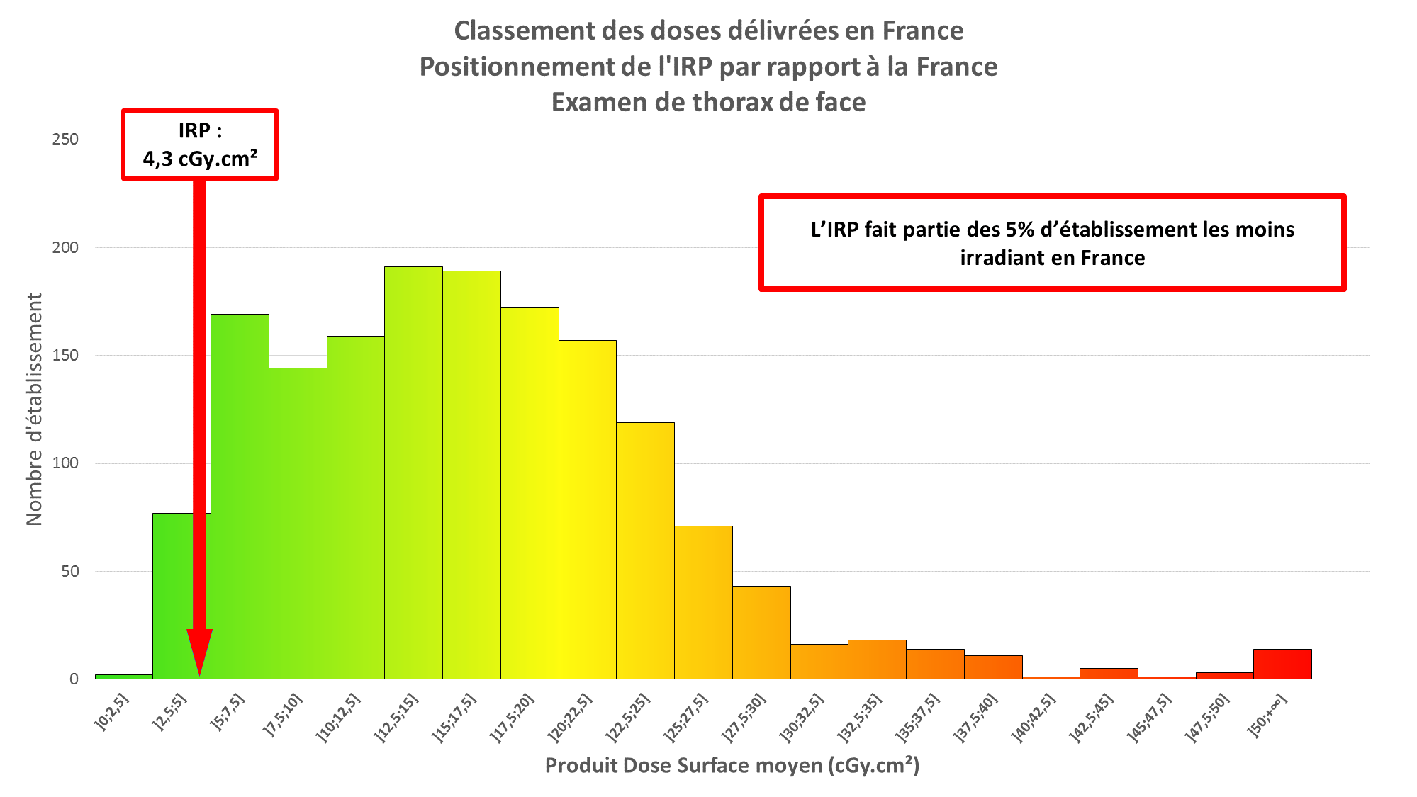 L’IRP fait partie des établissements les moins irradiants de France, quelle que soit la localisation étudiée (partie gauche de la courbe).